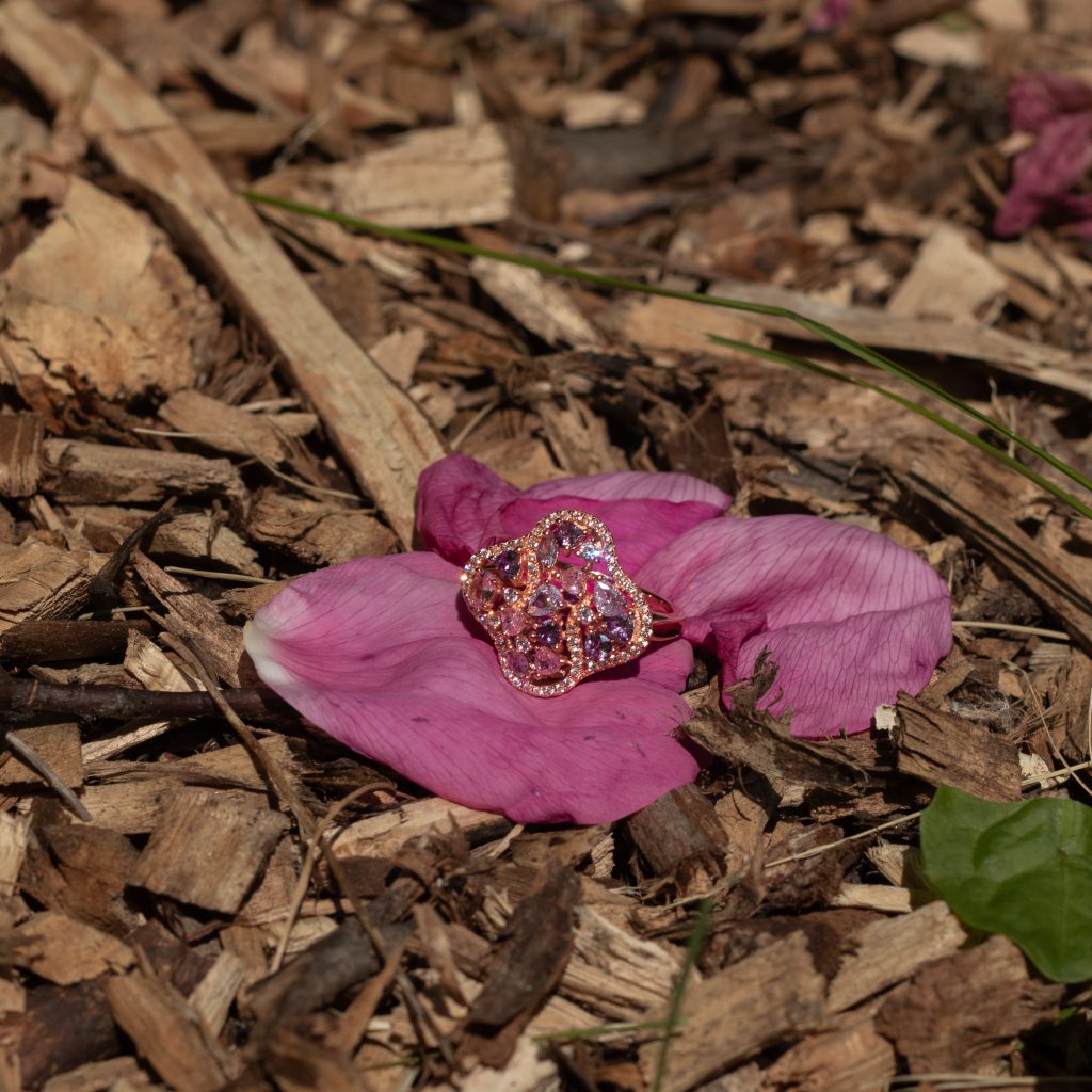 Les pierres mauves et roses – soigneusement serties – apportent un éclat subtil et poétique, rappelant les pétales d’un dahlia sous la rosée. Dahlia est plus qu’un bijou : c’est une émotion à porter au quotidien, une façon discrète mais audacieuse d’exprimer son Nindo.