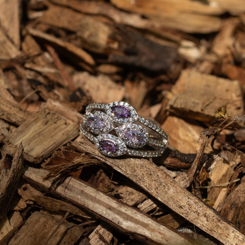 Inspirée par la fleur d’iris – symbole de sagesse, de royauté et de mystère – la bague Iris incarne une élégance presque spirituelle. Conçue en argent 925, elle est sertie d’un subtil mélange de pierres violettes et mauves, évoquant les dégradés profonds d’un ciel au crépuscule.