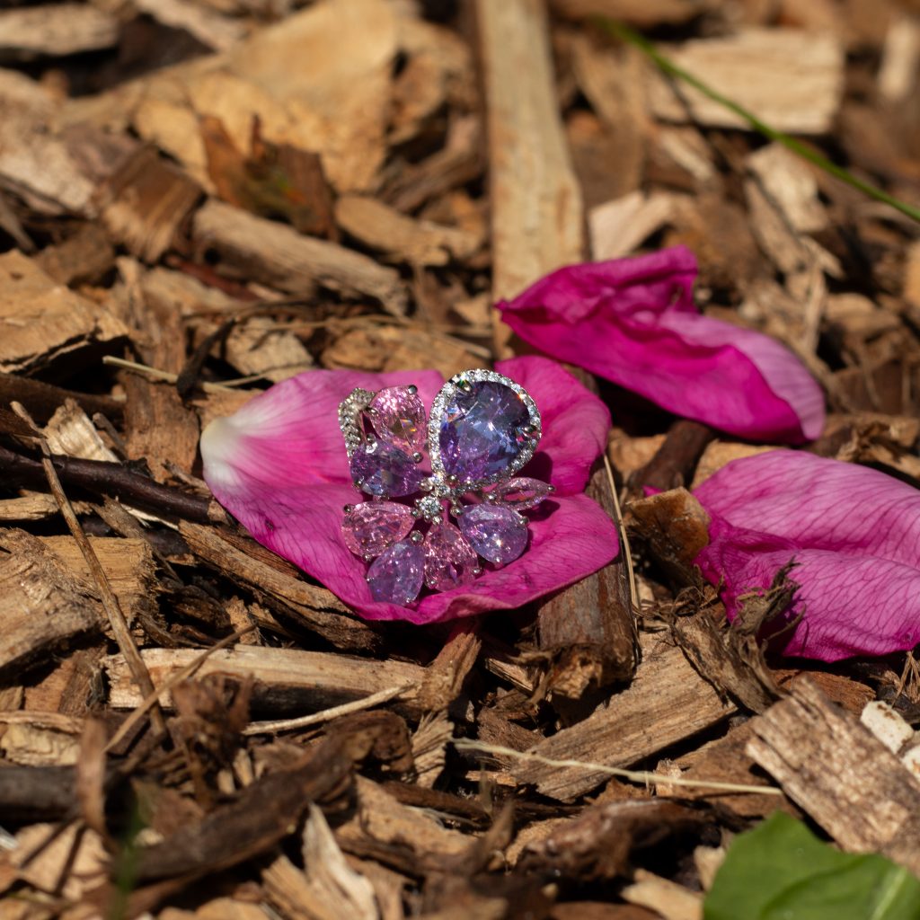 La bague Lavande évoque un champ en fleurs sous la lumière dorée d’un soir d’été. Façonnée en argent massif 925, elle est sertie de pierres aux nuances subtiles de mauve et de rose, rappelant les teintes douces et enivrantes de la lavande en pleine floraison.